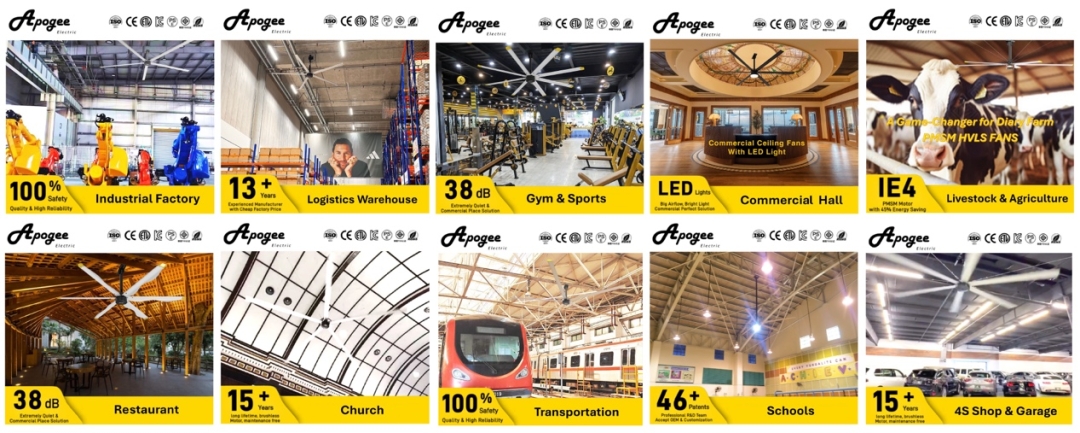 For gyms and fitness centers, the fan delivers gentle, consistent airflow that enhances cooling comfort during workouts, potentially boosting user satisfaction and retention. In restaurants and churches, its low-noise operation (38 dB) ensures unobtrusive air circulation without disrupting conversations or services. For schools and commercial halls, the fan’s large coverage area (up to thousands of square meters per unit) provides uniform temperature distribution, reducing hotspots and improving indoor air quality. Like all Apogee products, the new commercial fan carries ISO, CE, and RoHS certifications, guaranteeing compliance with global safety and environmental standards.
