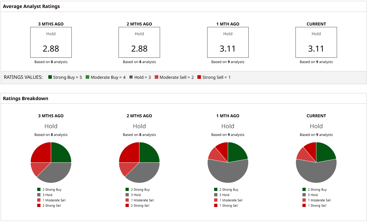 Analysts are measured on Whirlpool, but it should be noted that the overall consensus is slightly better today than it was three months ago. Currently, nine analysts are following the stock, with five of them recommending that investors hold. Two have “Buy” ratings and the other two have “Sell” ratings.
