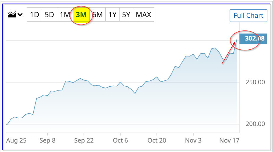Since Friday, Nov. 14, after it was revealed that Berkshire had bought $4.3 billion worth of Alphabet stock as of Sept. 30, GOOGL stock has risen almost 10% from $274.91.
