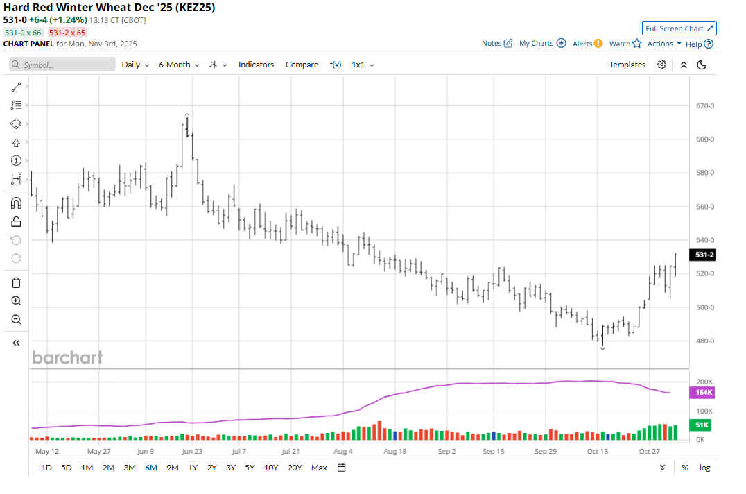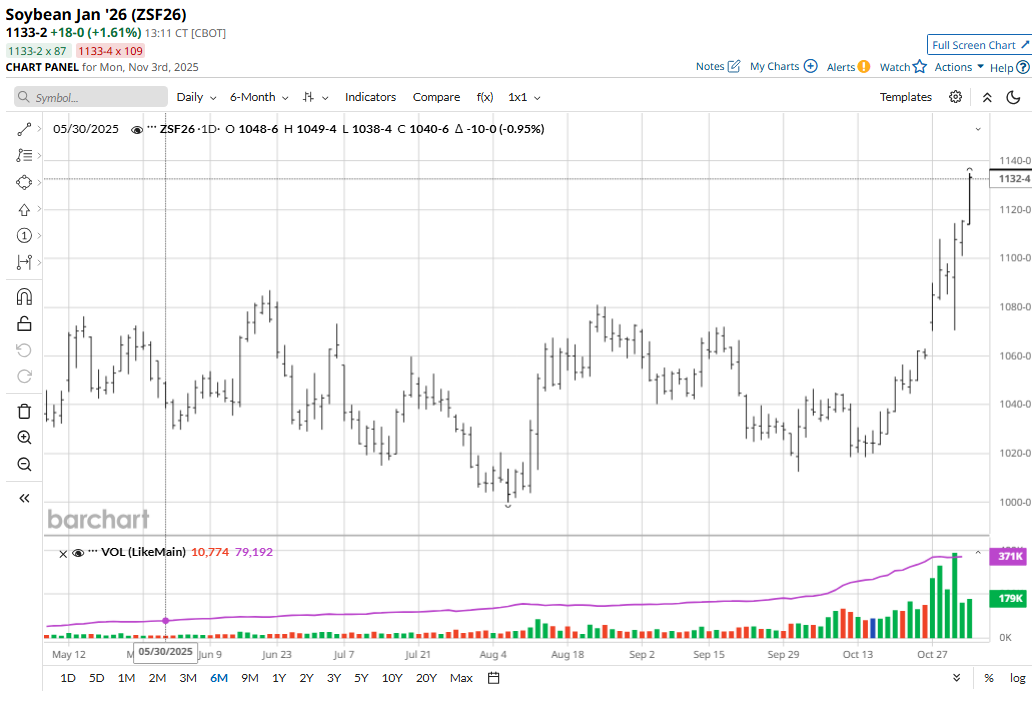 January soybeans (ZSF26) hit a 13-month high on Friday and for the week rose 55 cents. December soybean meal (ZMZ25) hit a nearly nine-month high and on the week gained $23.40. December corn (ZCZ25) futures last week gained 8 1/4 cents and on Friday hit a four-month high. December soft red winter (SRW) (ZWZ25) wheat last week gained 21 1/2 cents. December hard red winter (HRW) (KEZ25) wheat rose 23 cents for the week.