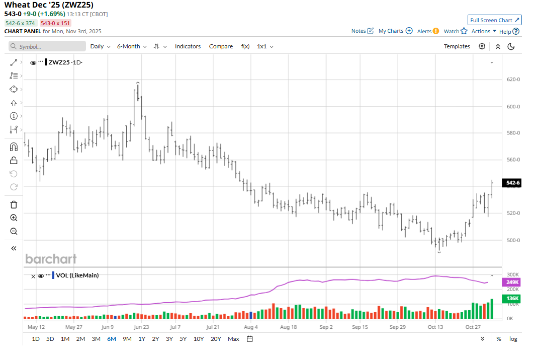 China will suspend all levies announced since March 4 on U.S. agricultural products, according to a White House fact sheet released over the weekend. The fact sheet is the most detailed account yet regarding the U.S.-China trade truce made during the summit meeting last week. The apparent renewed interest in U.S. wheat comes as China’s overall imports of wheat have fallen to less than a third in the first nine months of this year from the same period in 2024 as Beijing moved to bolster domestic prices due to sluggish demand and ample supply.