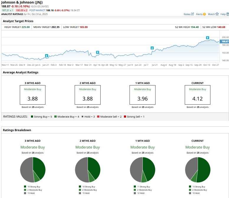 On Oct. 14, JNJ shares dipped marginally after the company announced results for the third quarter of 2025. With a revenue growth of 6.8% year over year to $24 billion and an adjusted EPS rise of 16% to $2.80, JNJ delivered solid topline and bottom-line growth. Based on the strong quarter, the company raised its full-year 2025 revenue guidance midpoint to about $93.2 billion, while maintaining its full-year adjusted EPS guidance at approximately $10.85.