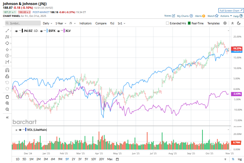 Looking specifically at the healthcare space, JNJ has also pulled ahead of the Health Care Select Sector SPDR Fund (XLV), which has risen 4.9% in 2025 and 2.6% drop over the past 52 weeks.