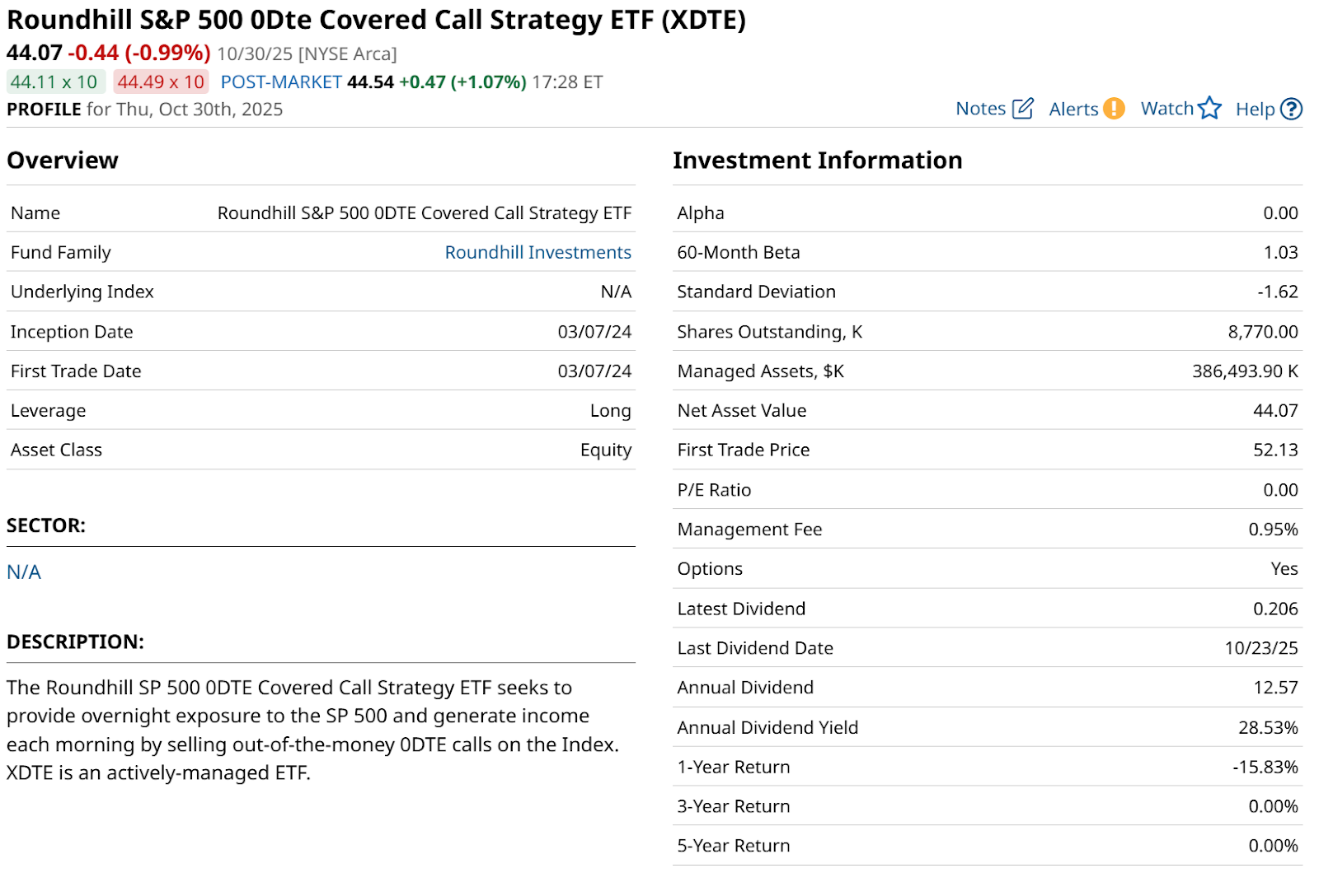 Through Wednesday, Oct. 29’s close, XDTE’s total return (not shown in table) was about 10% year to date. That compares to about 17% for the S&P 500. Since XDTE’s inception on March 7, 2024, it is up 28% versus 35% for the S&P 500. Competitive, a high yield, but where’s the “alpha” for the risk taken? This is something investors need to think about.