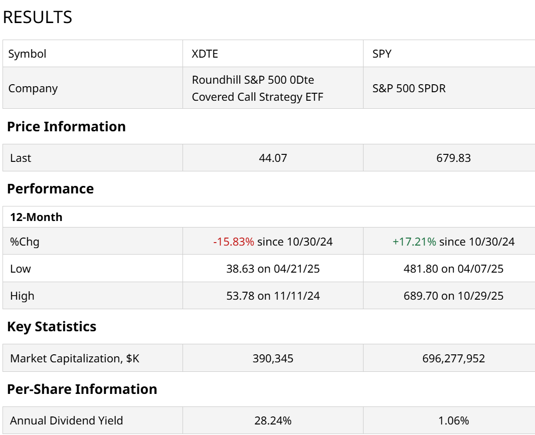 Comparing XDTE to an S&P 500 Index ($SPX) ETF (SPY) below, we see how this plays out.