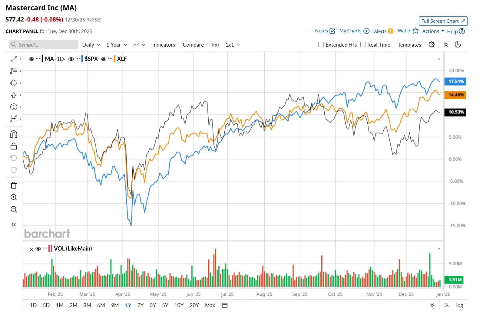 Shares of MA have gained 9.9% over the past 52 weeks, underperforming both the S&P 500 Index's ($SPX16.8% return and the State Street Financial Select Sector SPDR ETF’s (XLF14.3% uptick over the same time period.