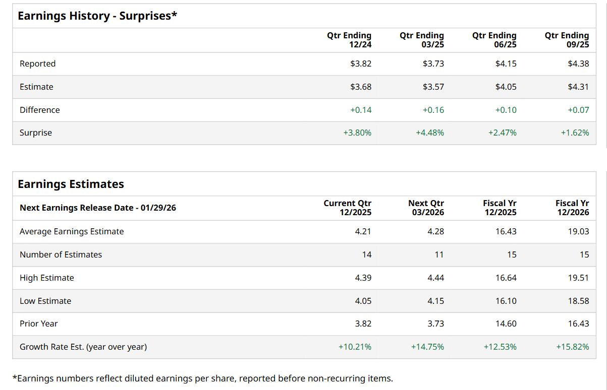 Ahead of this event, analysts expect this financial company to report a profit of $4.21 per share, up 10.2% from $3.82 per share in the year-ago quarter. The company has topped Wall Street’s earnings estimates in each of the last four quarters. In Q3, MA’s EPS of $4.38 exceeded the forecasted figure by 1.6%