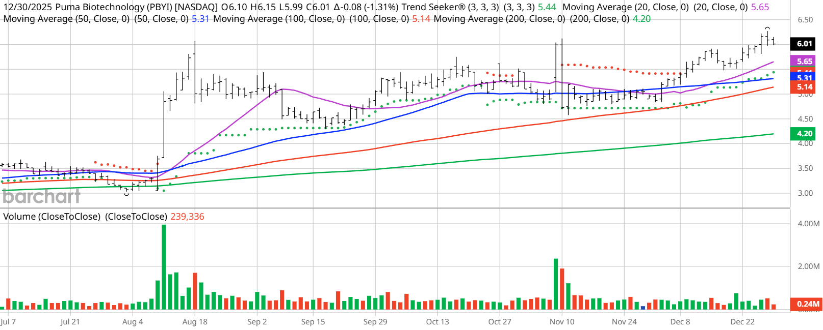 I found today’s Chart of the Day by using Barchart’s powerful screening functions to sort for stocks with the highest technical buy signals; superior current momentum in both strength and direction; and a Trend Seeker “buy” signal. I then used Barchart’s Flipcharts feature to review the charts for consistent price appreciation. PBYI checks those boxes. Since the Trend Seeker signaled a new “Buy” on Dec. 9, the stock has gained 8.24%.