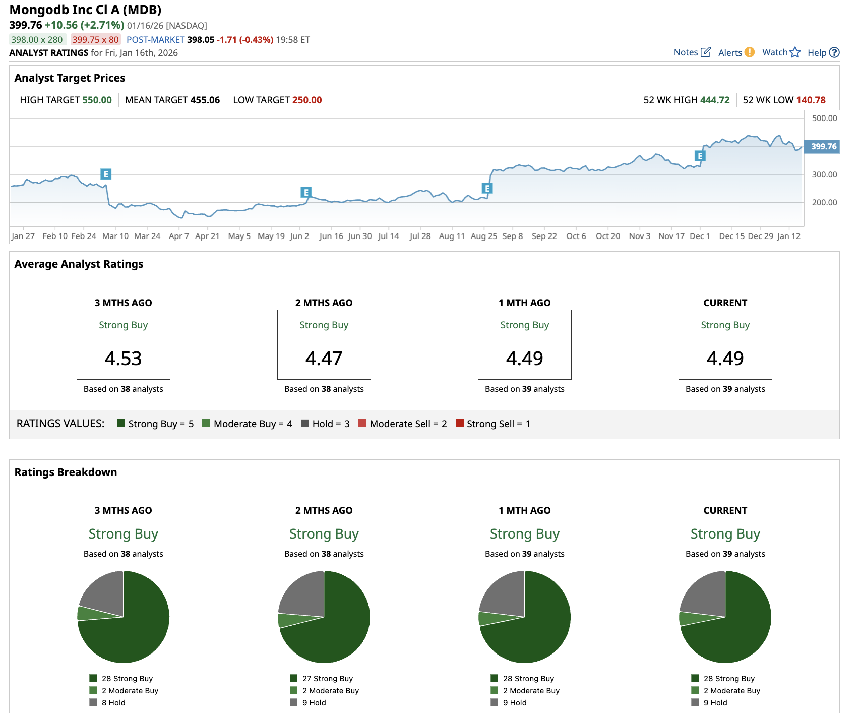 Out of the 39 analysts covering MDB stock, 28 recommend “Strong Buy,” two recommend “Moderate Buy,” and nine recommend “Hold.” The average MDB stock price target is $455, above the current price of $400.