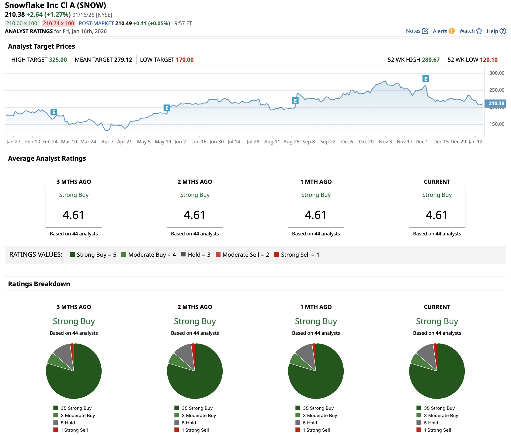 Out of the 44 analysts covering SNOW stock, 35 recommend “Strong Buy,” three recommend “Moderate Buy,” five recommend “Hold,” and one recommends “Strong Sell.” The average SNOW stock price target is $279, above the current price of $210.
