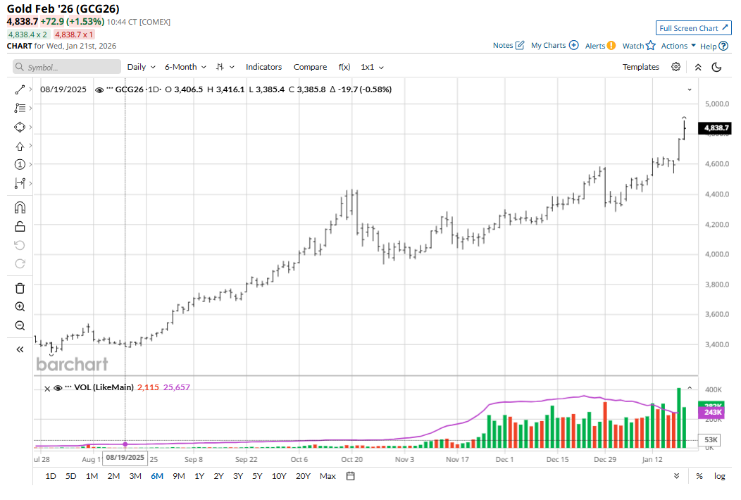 Gold (GCG26) prices at mid-week were solidly higher but down from an overnight high that set another record of $4,891.10, basis February Comex futures.
