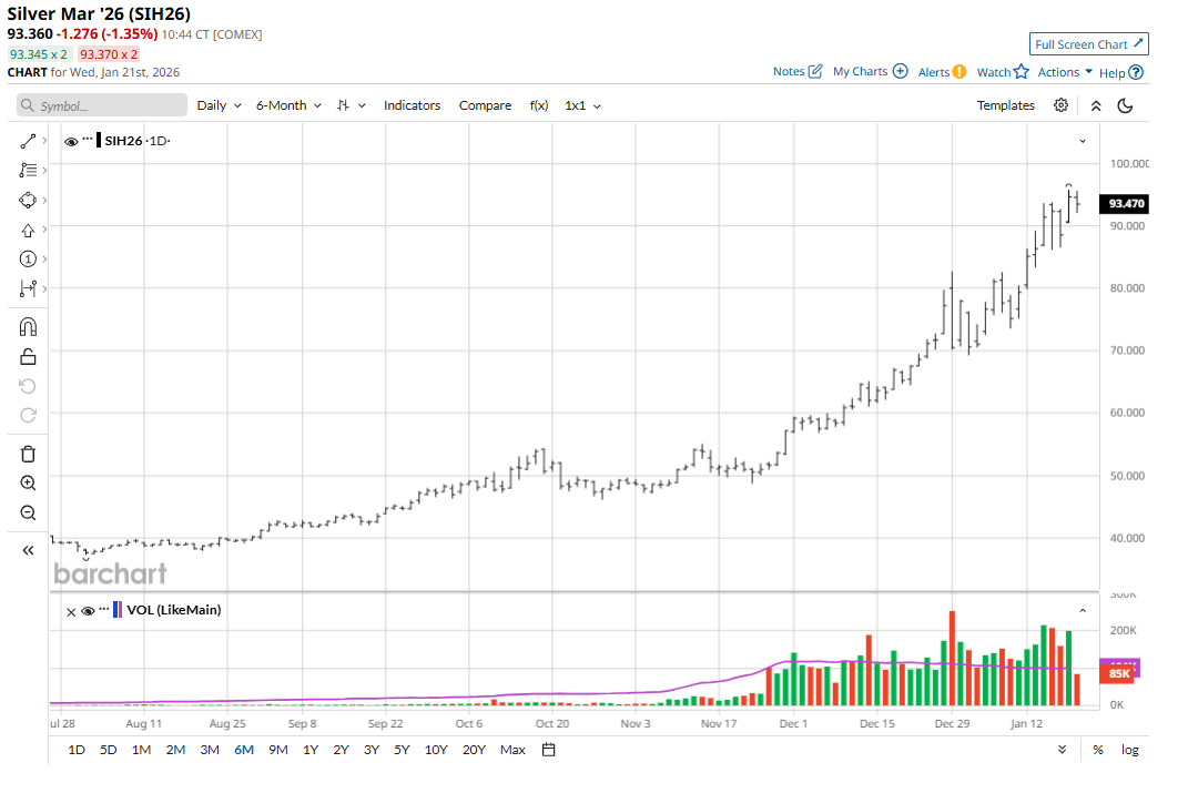 Gold and silver prices this week have extended their record rallies as the crisis over Greenland and a meltdown in Japanese government debt support safe-haven demand. March silver (SIH26) futures on Tuesday hit a new peak of $95.78 an ounce.