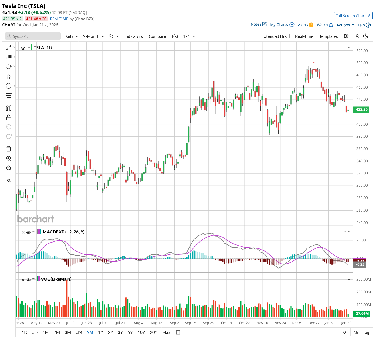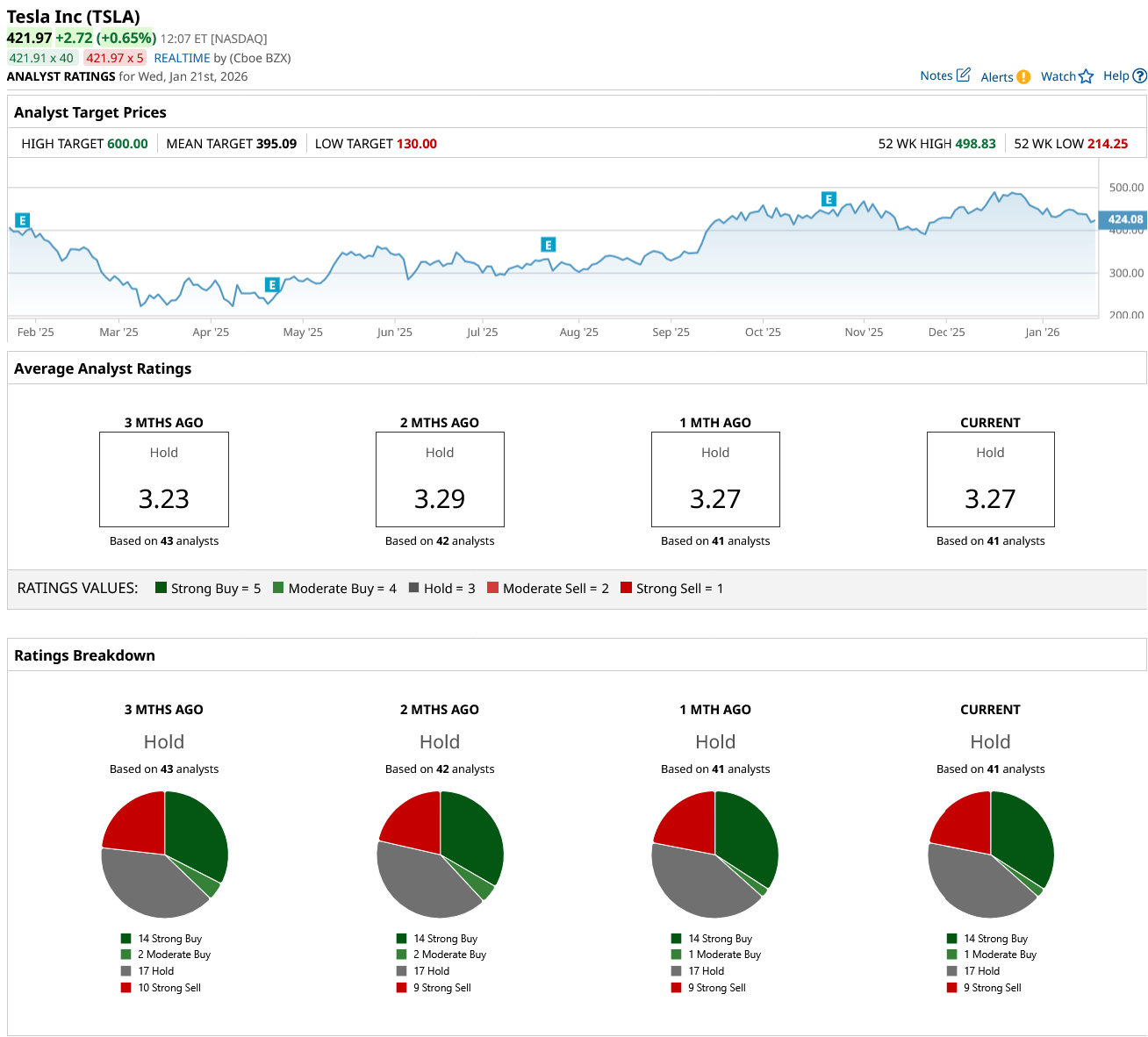 Out of the 41 analysts covering TSLA stock, 14 recommend “Strong Buy,” one recommends “Moderate Buy,” 17 recommend “Hold,” and nine recommend “Strong Sell.” The average TSLA stock price target is $395.09, below the current price of $421.