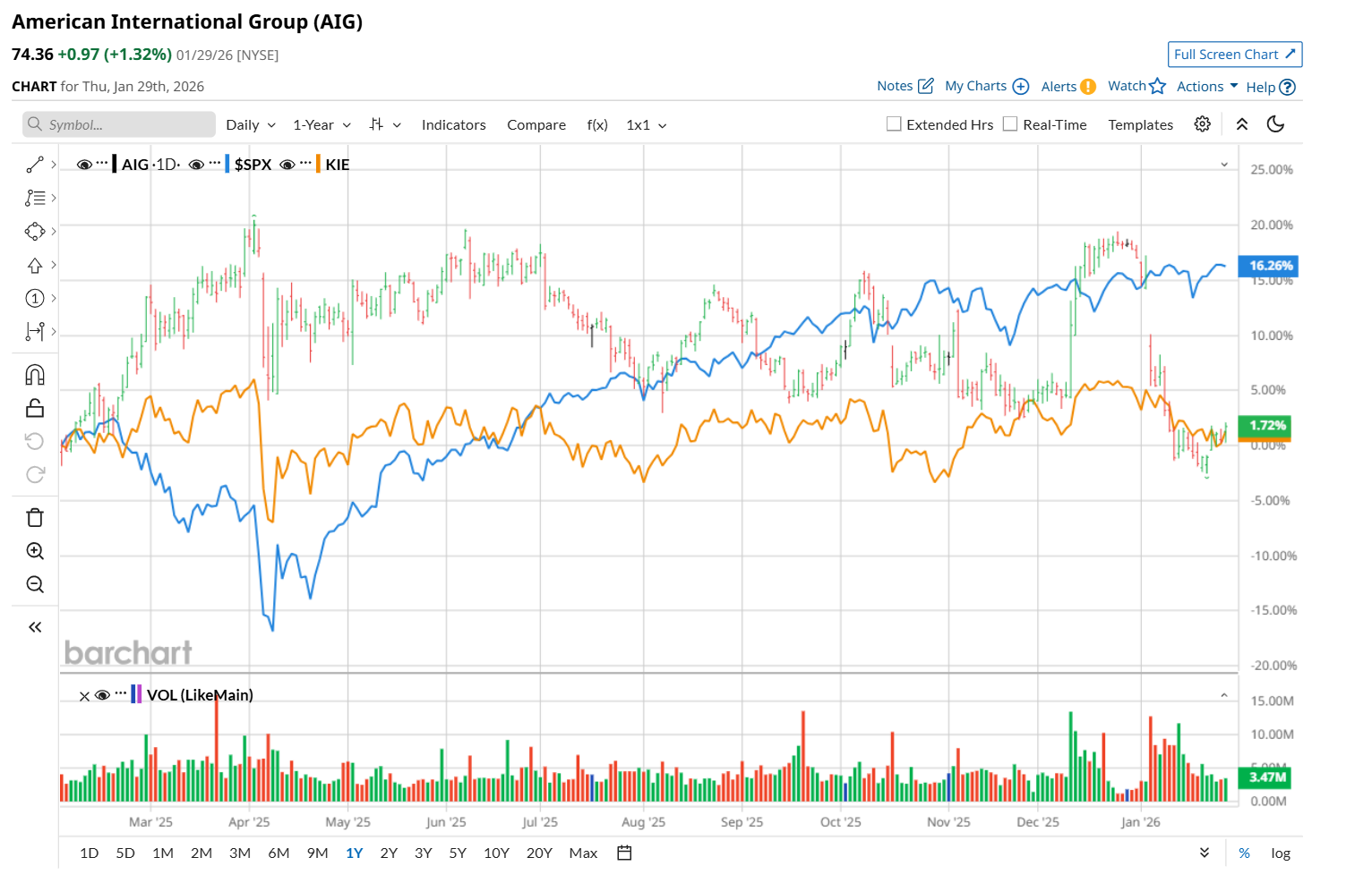 Narrowing the focus, AIG has also trailed behind the State Street SPDR S&P Insurance ETF (KIE), which rose marginally over the past 52 weeks and dropped 2.9% on a YTD basis.