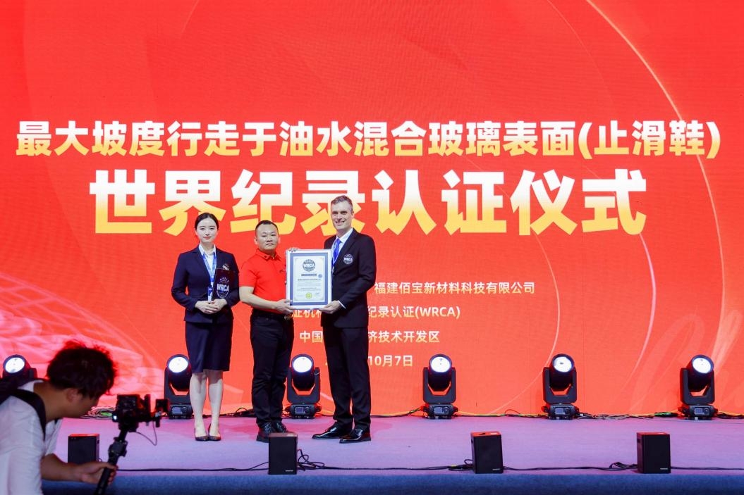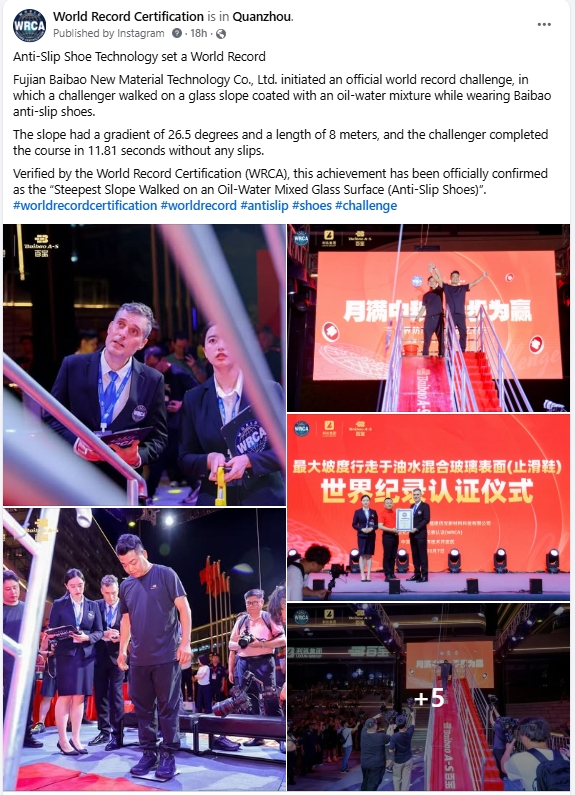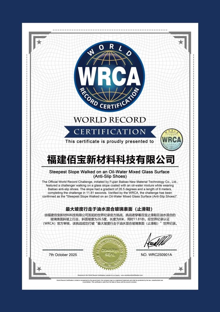 This challenge was conducted under the full supervision of James, a world record official assigned by the UK headquarters of the World Record Certification Limited (abbreviated as WRCA)), and Yiz, the Chinese representative. After on-site strict inspection, the tempered glass slope with an inclination angle of 26.5 degrees and a length of 8 meters was confirmed to meet the requirements. The surface was coated with a mixture of oil and water in a ratio of 1:9, and the anti-slip shoes used were commercially available products. The challenger wore Baibao Anti-Slip Shoes and walked upward steadily without slipping or pausing, completing the test successfully in 11.81 seconds and obtaining the world record title. During the same event, Lian Jie, the world champion of FINA Diving, signed a contract to become the brand endorser.
