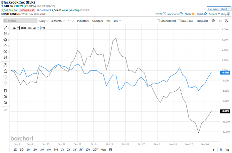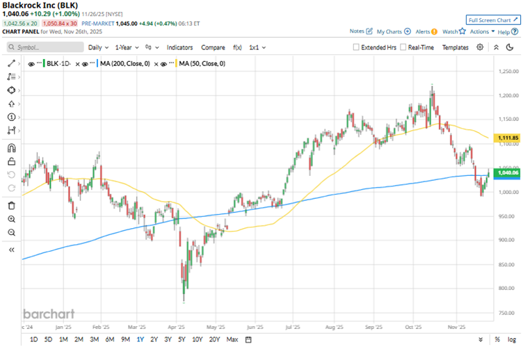 Over the longer term, this underperformance persists. Over the past 52 weeks, BlackRock’s stock has gained 1.3%, while it has been up almost 8% over the past six months. The iShares U.S. Financials ETF, in contrast, has gained 5.3% and 9.3% over the same periods, respectively. The stock is hovering near its 200-day moving average but has traded below its 50-day moving average since late October.