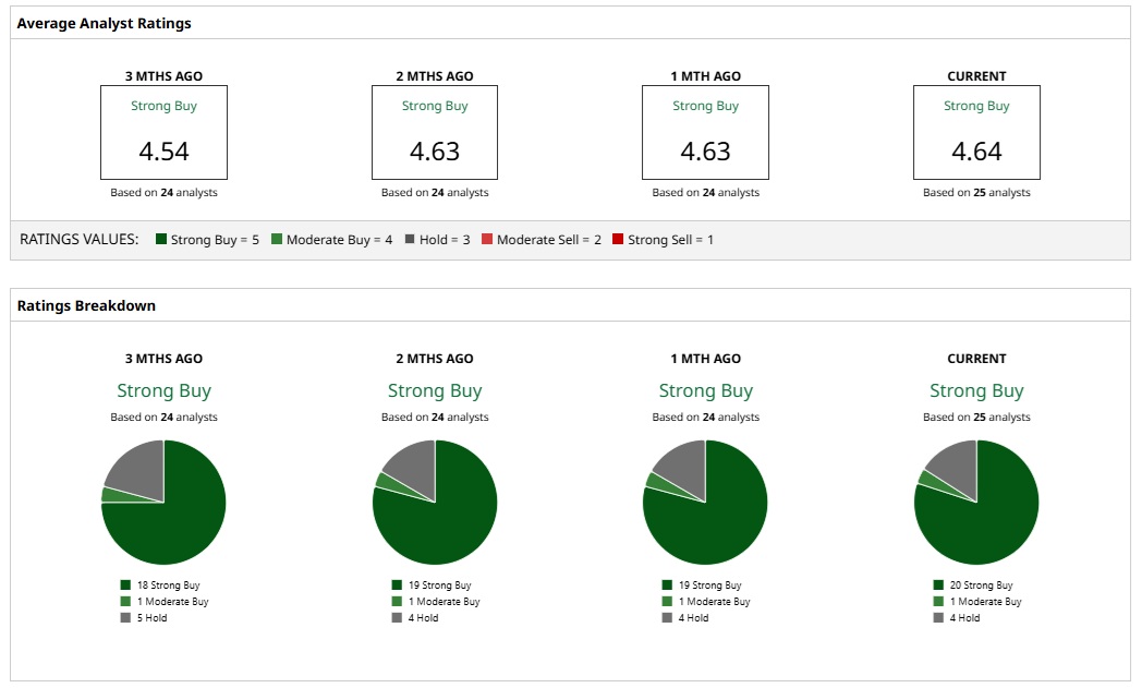 While 20 analysts have assigned a “Strong Buy” rating, one and four analysts have a “Moderate Buy” and “Hold” rating, respectively.