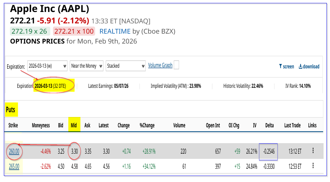 This one-month short-put play can be repeated for a similar return. For example, the March 13, 2026, expiry period shows that the $260.00 strike price put has a midpoint premium of $3.30.