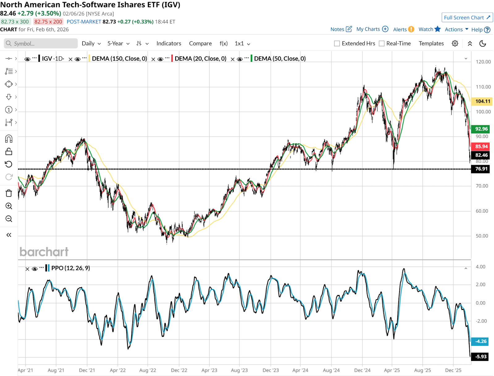 This shift in perception is hitting the iShares Expanded Tech-Software Sector ETF (IGV), which I wrote about in a recent article, with historic force. Since the start of the year, software stocks have been slammed, and the carnage has accelerated over the last two weeks.