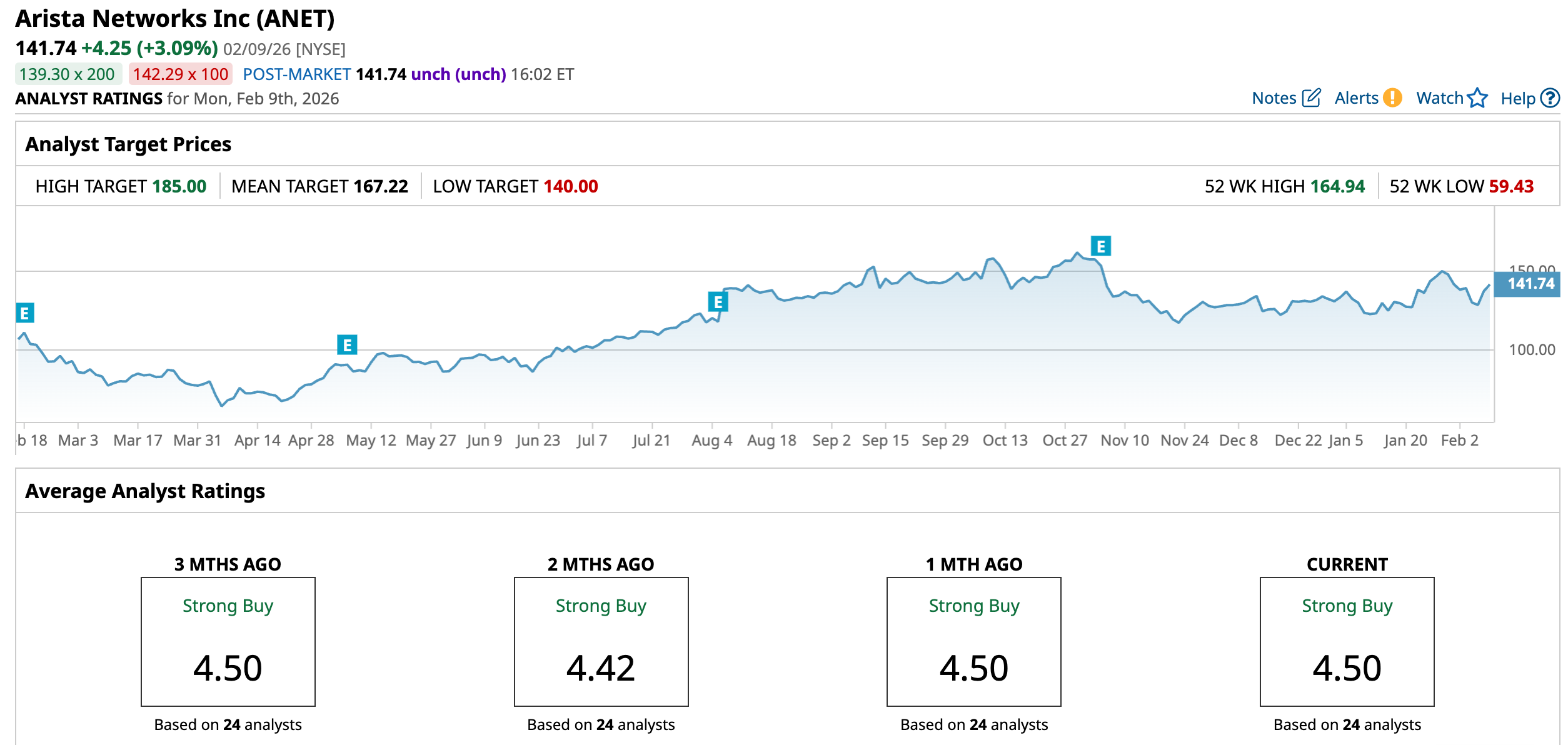 Arista stock is up 2.9% so far this year. Nonetheless, Wall Street believes the stock can climb 18% from its current levels to reach its average target price of $167.22. Plus, its Street-high estimate of $185 implies a potential upside of about 30.5% in the next 12 months. Overall, Wall Street rates Arista stock a “Strong Buy.” Out of the 24 analysts covering Arista stock, 17 have a “Strong Buy” recommendation, two rate it a “Moderate Buy,” and five suggest it’s a “Hold.”