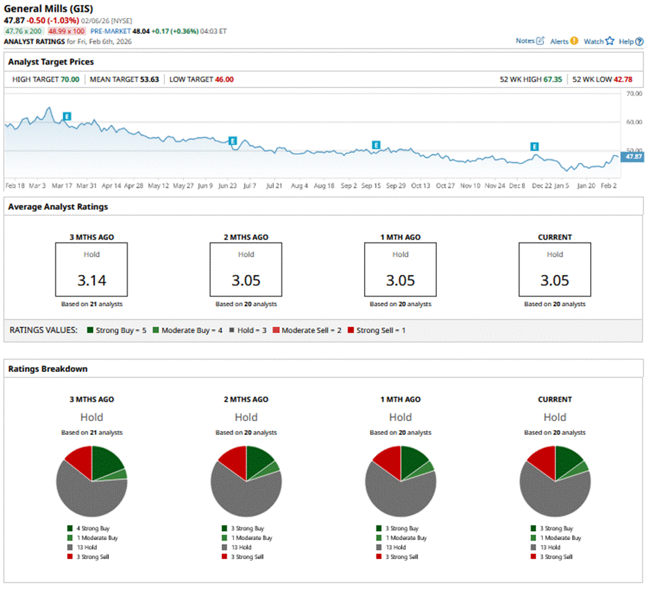 GIS has a consensus “Hold” rating overall. Of the 20 analysts covering the stock, opinions include three “Strong Buys,” one “Moderate Buy,” 13 “Holds,” and three “Strong Sells.”