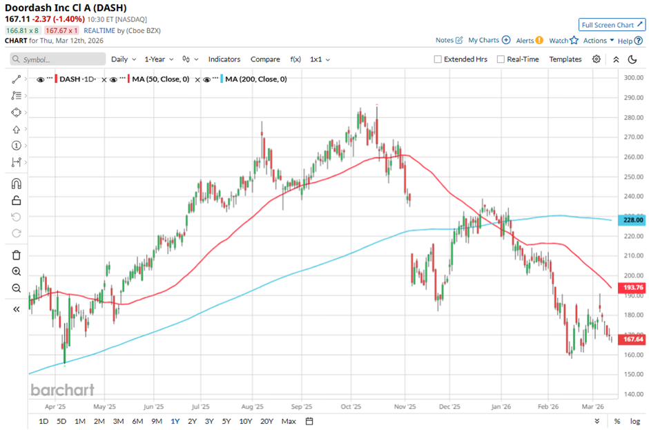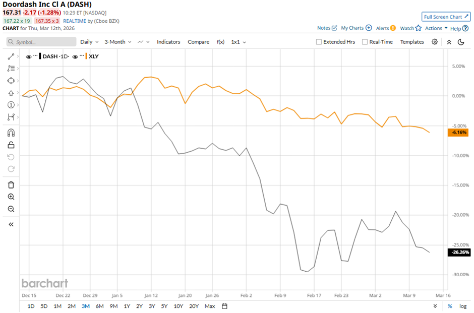 Shares of the Francisco, California-based company have declined 41.2% from its 52-week high of $285.50. DASH stock has dropped 26.4% over the past three months, underperforming the State Street Consumer Discretionary Select Sector SPDR ETF’s (XLY) 6.3% decrease over the same time frame.