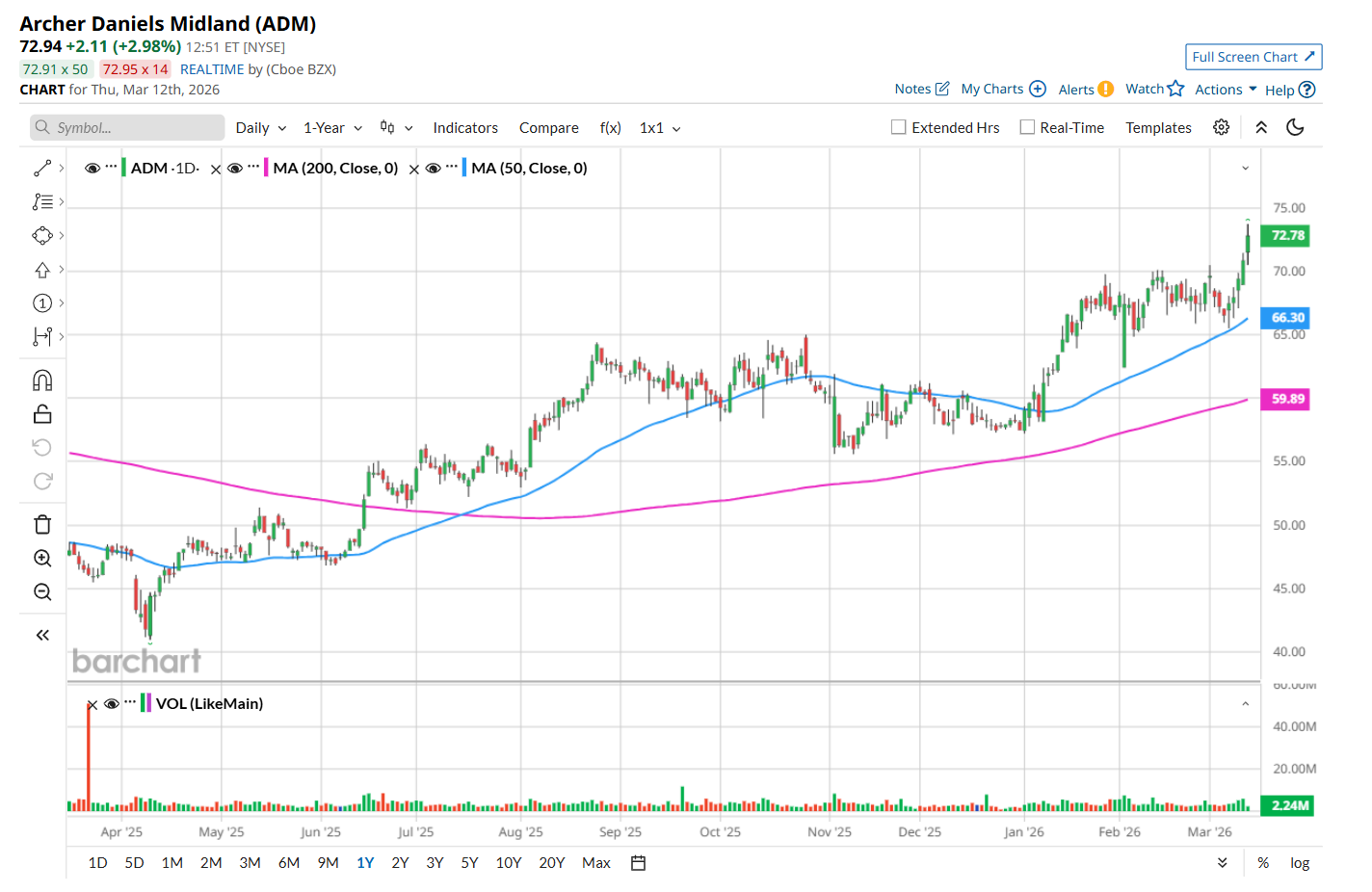To confirm its bullish trend, ADM has been trading above its 200-day moving average since mid-June and has remained above its 50-day moving average since early January.