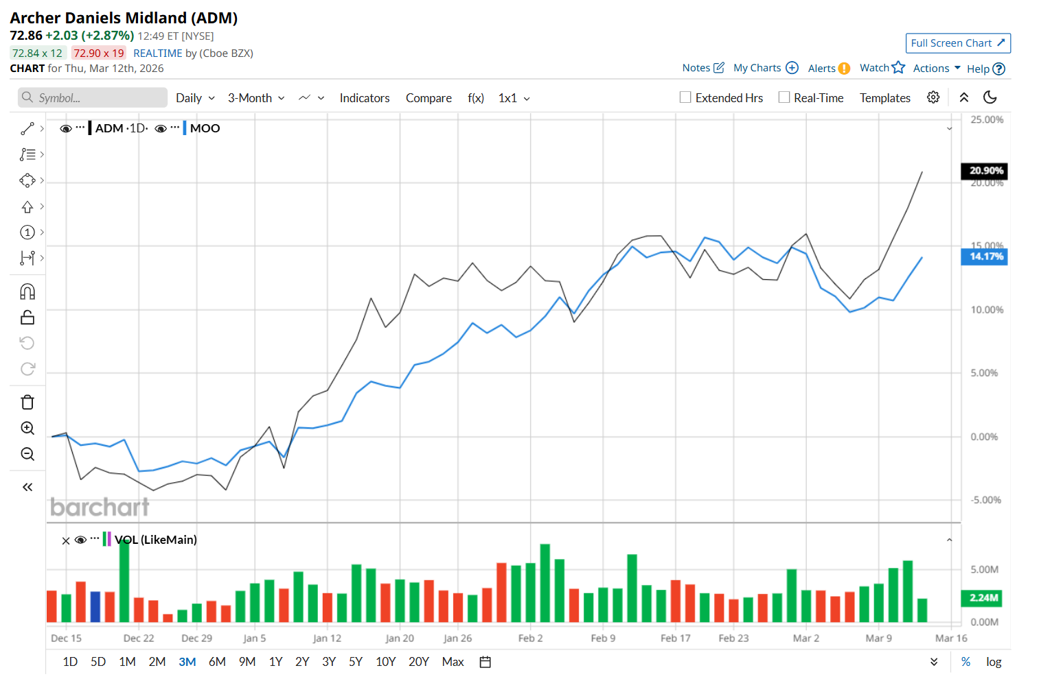 Moreover, on a YTD basis, shares of ADM are up 27.3%, compared to MOO’s 16.7% return. In the longer term, ADM has soared 55.5% over the past 52 weeks, considerably outpacing MOO’s 25.9% uptick over the same time frame.