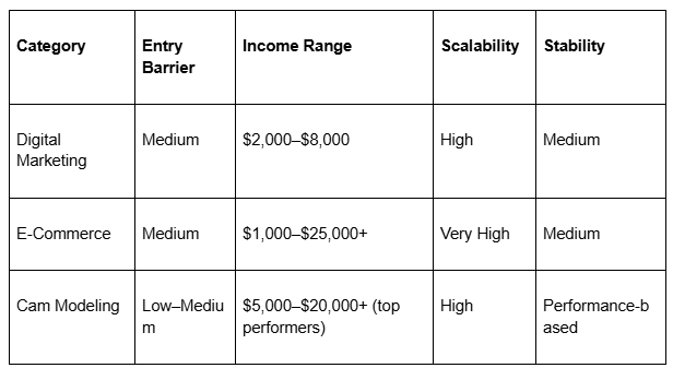 Whether through digital marketing, e-commerce, consulting, or structured performance-based platforms like cam modeling, the opportunity landscape remains wide and diverse.