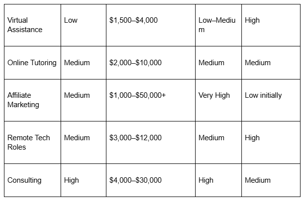 Fixed remote roles (virtual assistance, tutoring) offer predictability but limited upside.